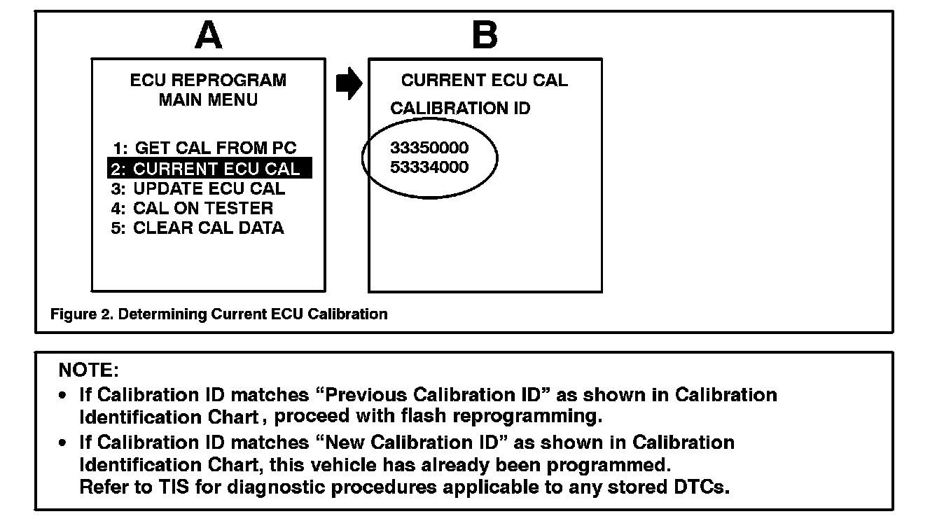 3. Connect the Diagnostic Tester to the vehicle and select CURRENT ECU CAL from the ECU REPROGRAM MAIN MENU. Determine the vehicle's current ECU calibration (see Figure 2).