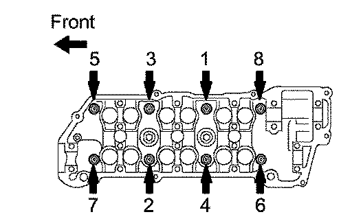 c. Uniformly install and tighten the 8 cylinder head bolts in the sequence shown in the illustration.