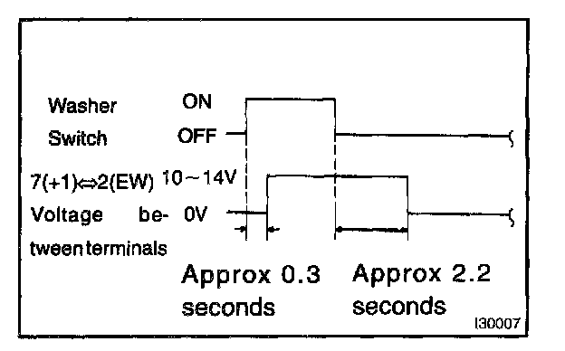 3. Connect the voltmeter (+) terminal to terminal 7 (+1) of the connector and the voltmeter (-) terminal to terminal 2 (EW) of the connector. Turn the washer switch to ON and OFF, and check voltage between terminal 7 (+1) and terminal 2 (EW).