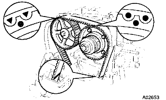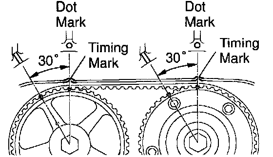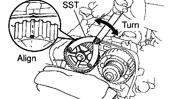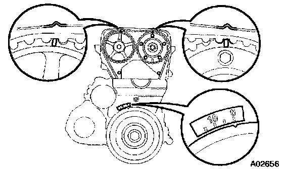 b. Check that each pulley aligns with the timing marks as shown in the illustration. If the marks do not align, remove the timing belt and reinstall it.