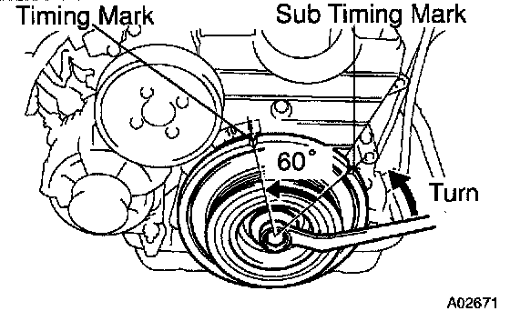 c. Turn the crankshaft pulley 60° counterclockwise to place the sub timing mark (60° mark BTDC) on the crankshaft pulley at the timing mark "0" position of the No.1 timing belt cover.