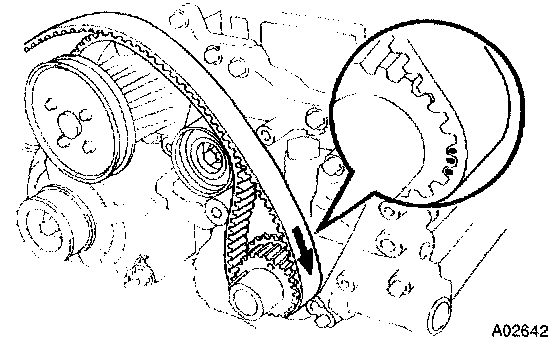 Draw an arrow on the timing belt in the direction of engine revolution, and place matchmarks on the timing belt and crankshaft timing pulley.