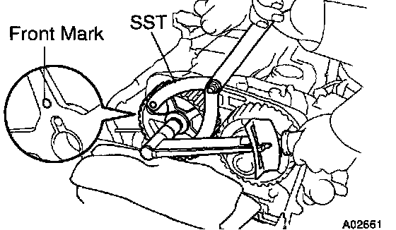 d. Using SST, align the dot mark on the camshaft timing pulley with the timing mark of the No.4 timing belt cover.