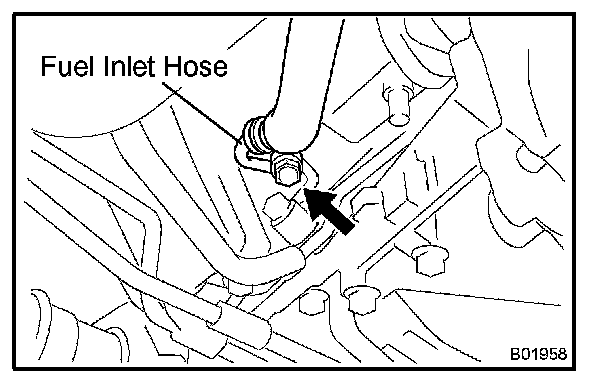 c. Remove the union bolt and 2 gaskets, and disconnect the fuel inlet hose from the fuel pipe support.