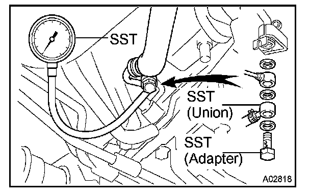 d. Install the fuel inlet hose and SST (pressure gauge) to the fuel pipe support with the 3 gaskets and SST (union and adapter).