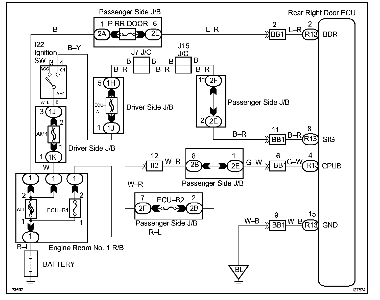 This circuit provides power to operate the rear right door ECU.