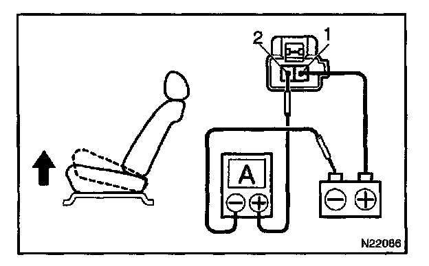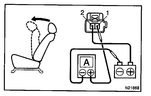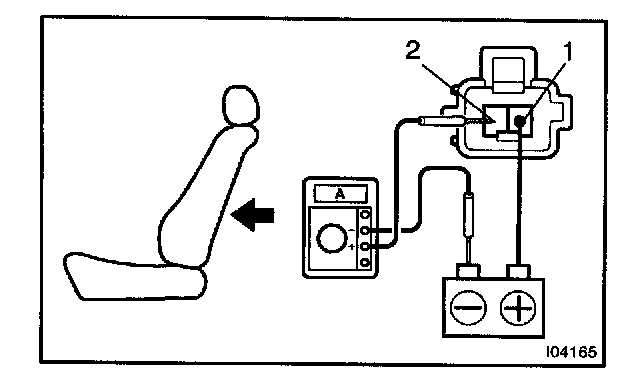 a. Connect the positive (+) lead from the battery to terminal 2, the positive (+) lead from the ammeter to terminal 1 and the negative (-) lead to the battery negative (-) terminal, then recline the seat back to the most forward position.