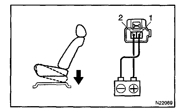 d. Approximately 60 seconds later, connect the positive (+) lead from the battery to terminal 1(2) and the negative (-) lead to terminal 2 (1), check that the seat cushion begins to descend.