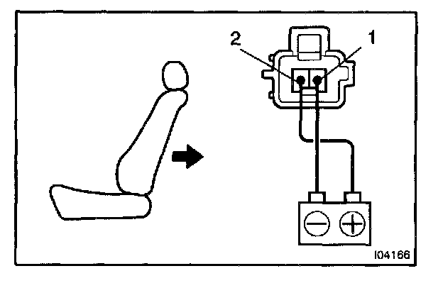 d. Approximately 60 seconds later, connect the positive (+) lead from the battery to terminal 2 (1) and the negative (-) lead to terminal 1(2), check that the seat cushion begins to move backwards.