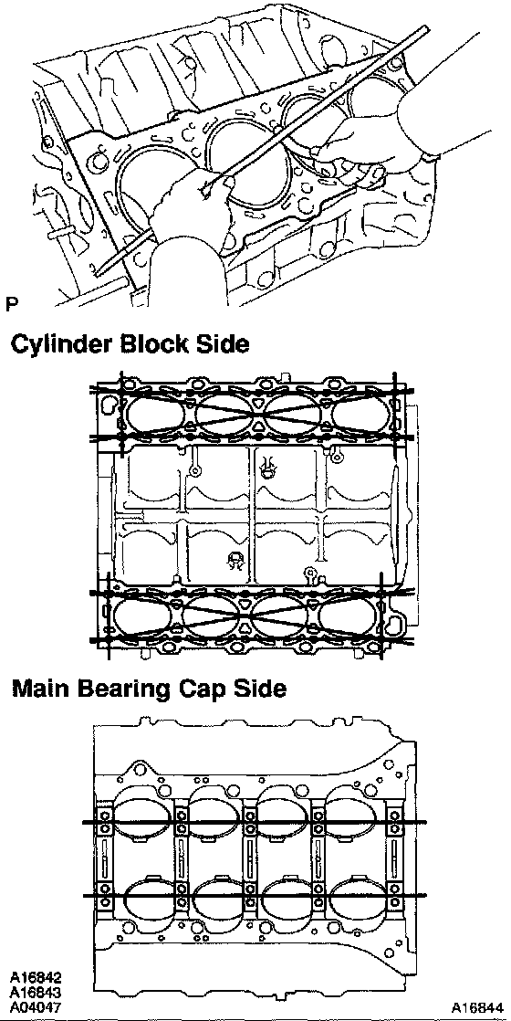 Using a precision straight edge and feeler gauge, measure the surfaces contacting the cylinder head and main bearing cap for warpage.
