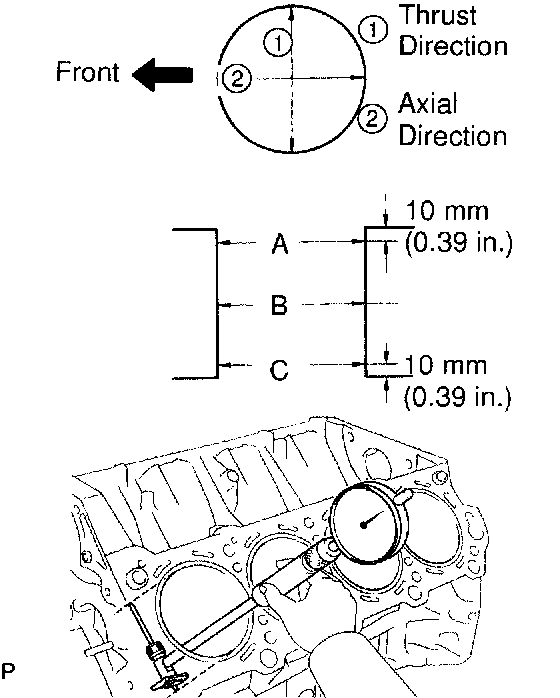 Using a cylinder gauge, measure the cylinder bore diameter at positions A, B and C in the thrust and axial directions.
