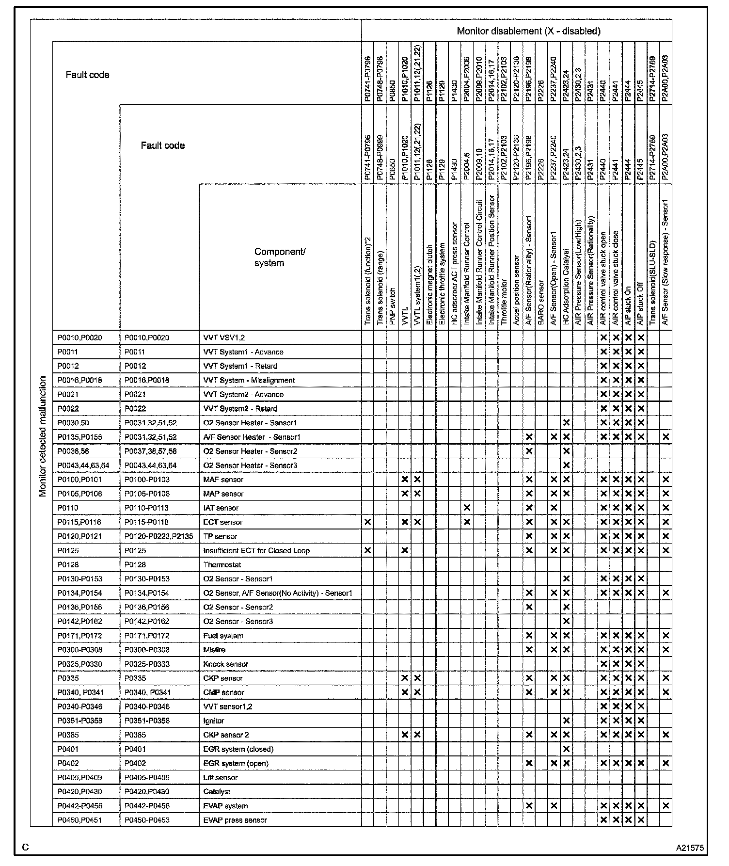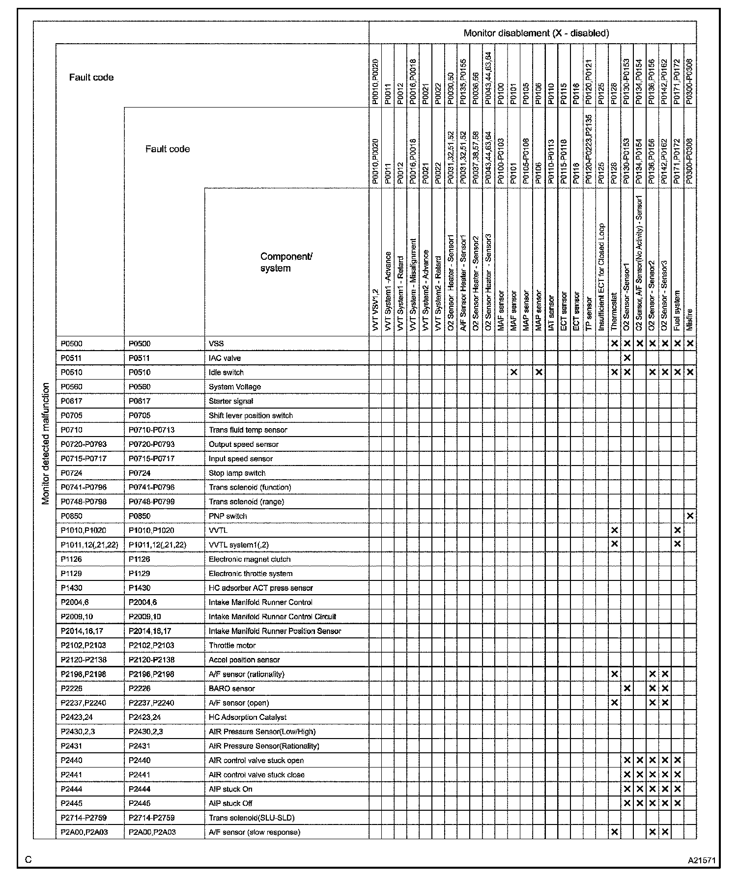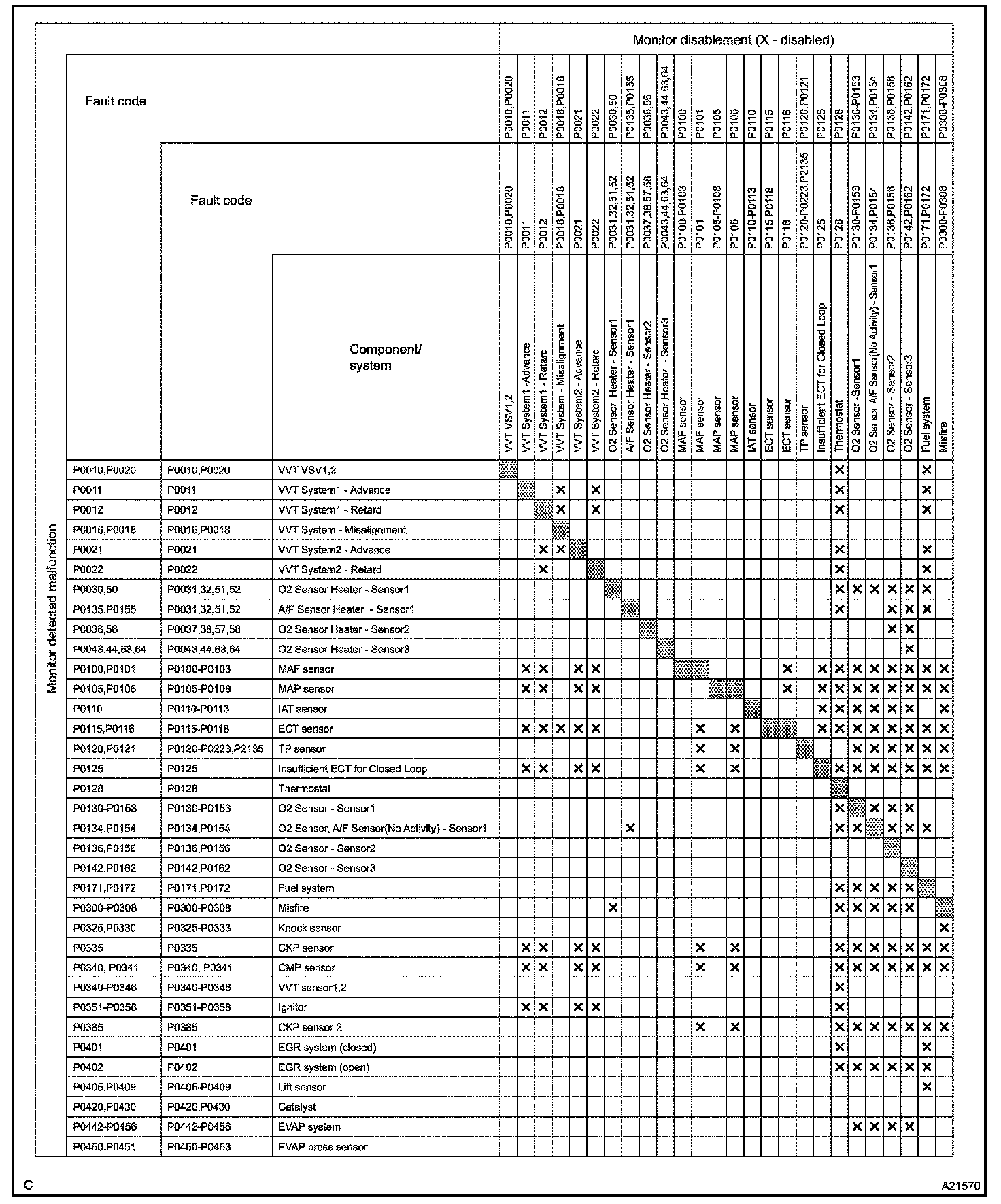The monitor will run whenever the following DTCs are not present (Monitor disablement List)HINT: This table indicates ECM monitoring status for the items in the upper columns if the DTCs in each line are being set.