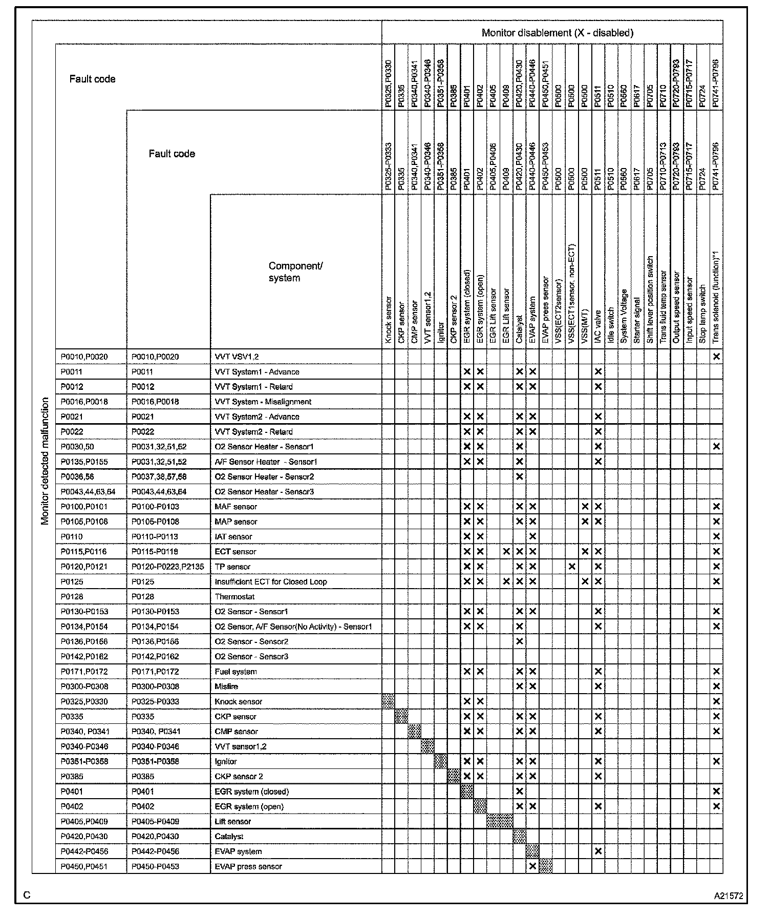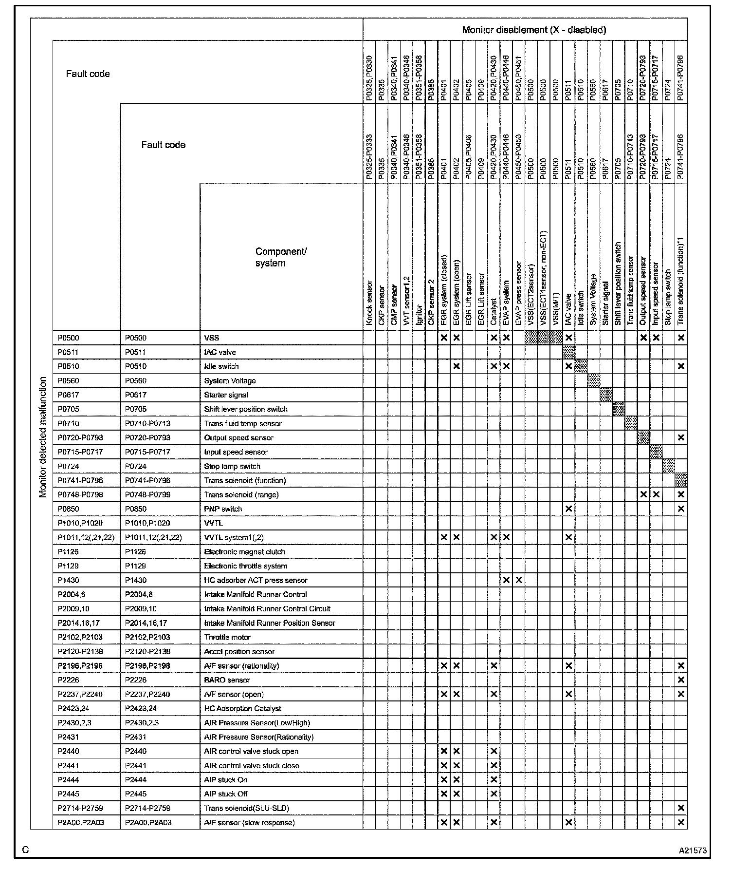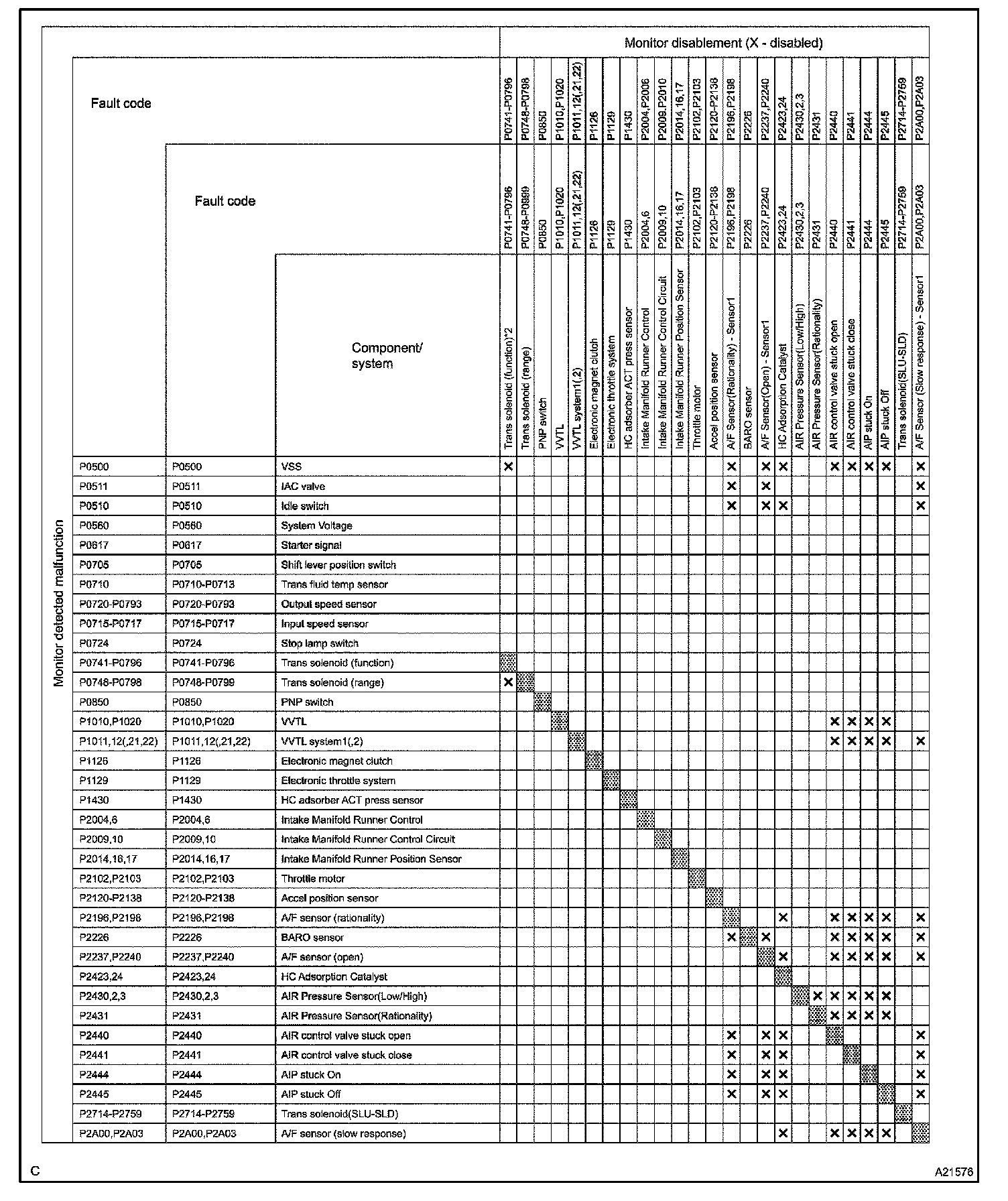 The monitor will run whenever the following DTCs are not present (Monitor disablement List)HINT: This table indicates ECM monitoring status for the items in the upper columns if the DTCs in each line are being set.