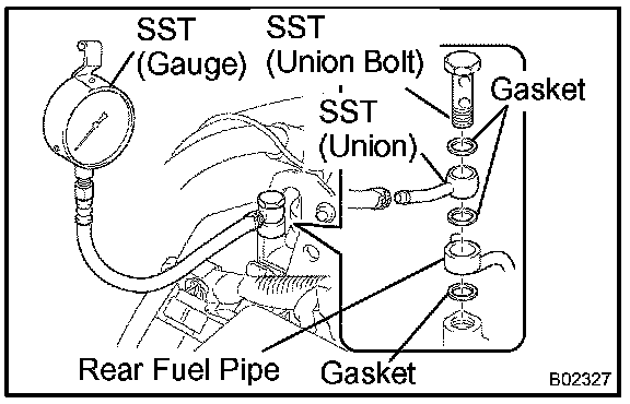 d. Install the rear fuel pipe and SST (pressure gauge) to the delivery pipe with 3 lower gaskets and SST (union bolt).