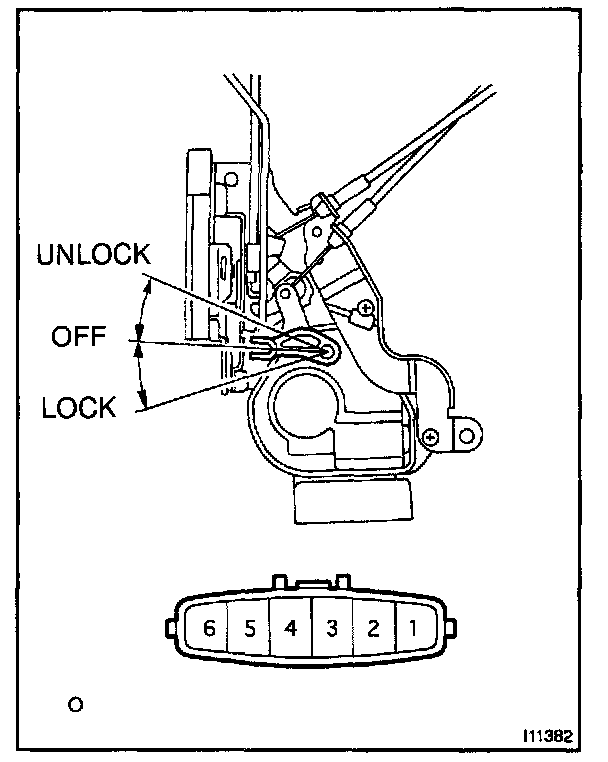 a. Connect the positive (+) lead from the battery to terminal 5 and the negative (-) lead to terminal 6, and check that the door lock link moves to LOCK position.