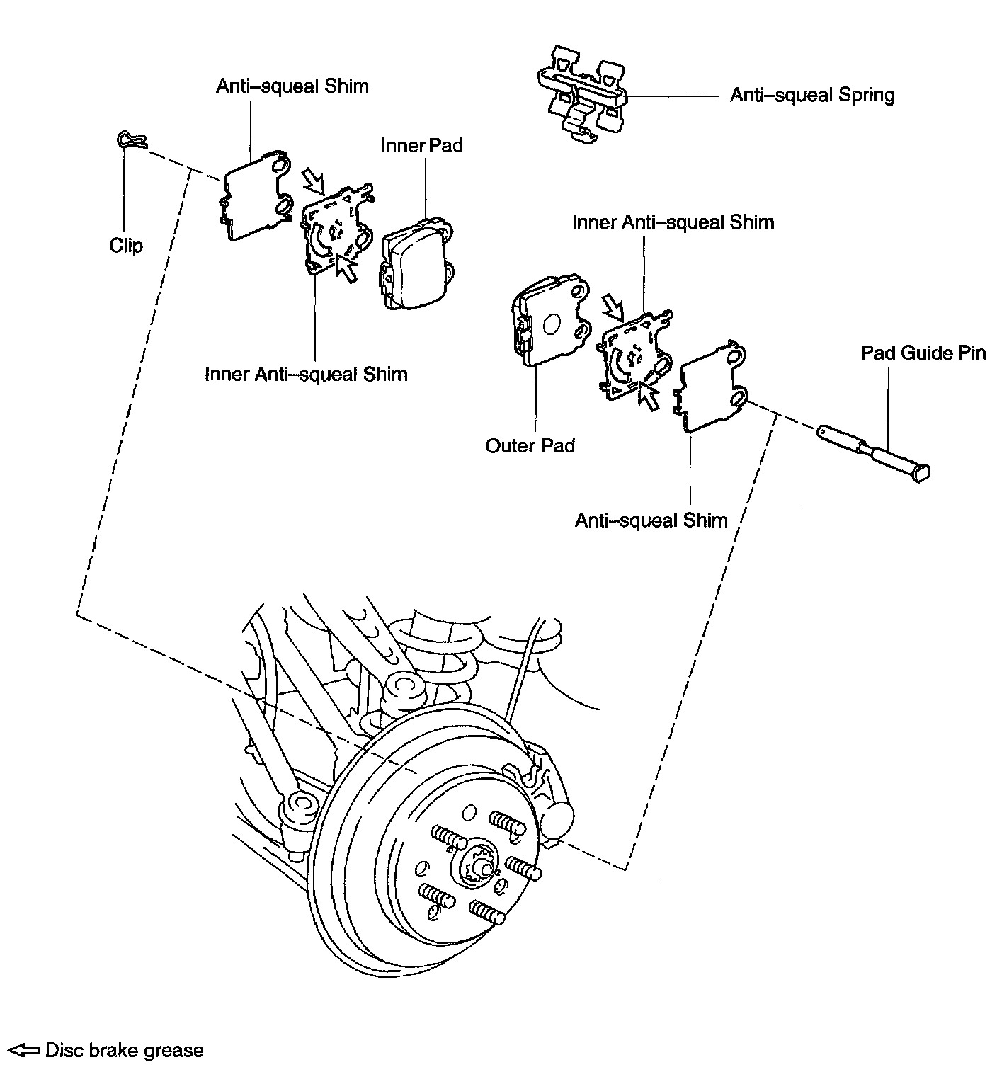 a. Apply disc brake grease to both sides of inner anti-squeal shims.