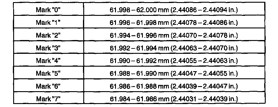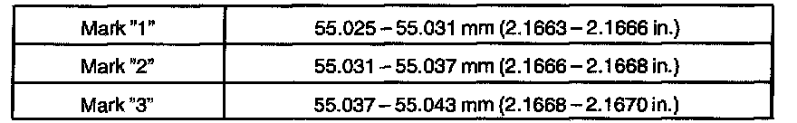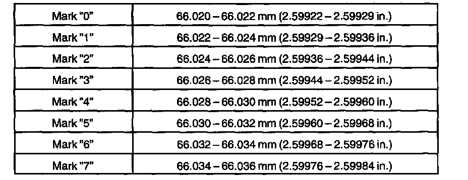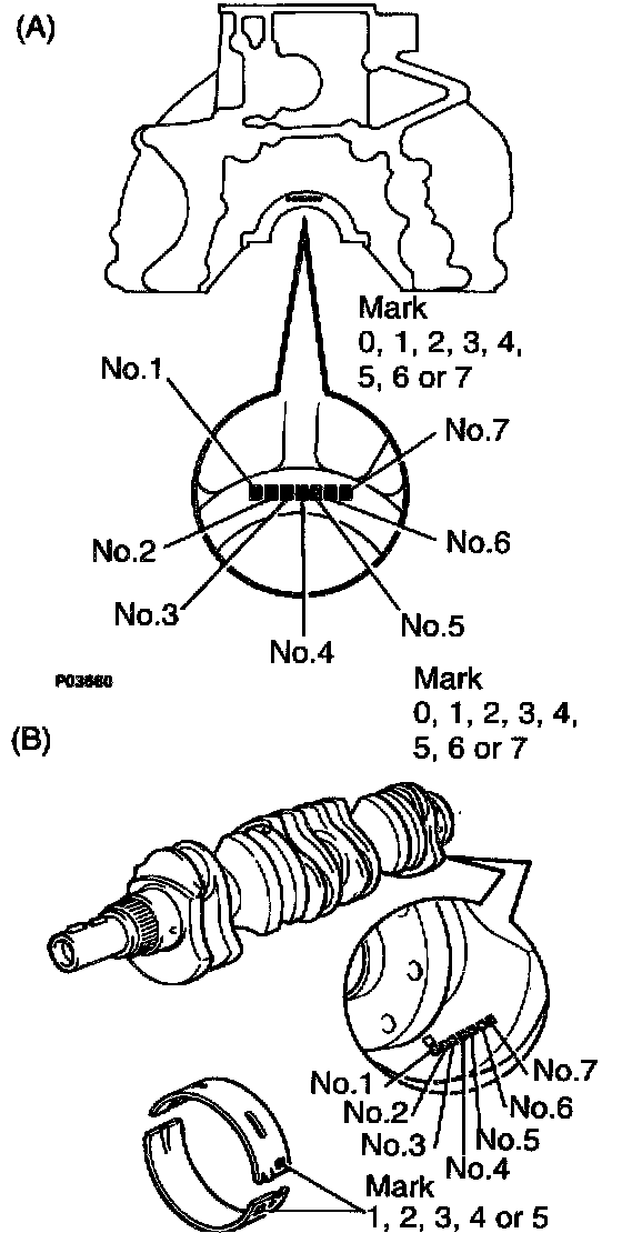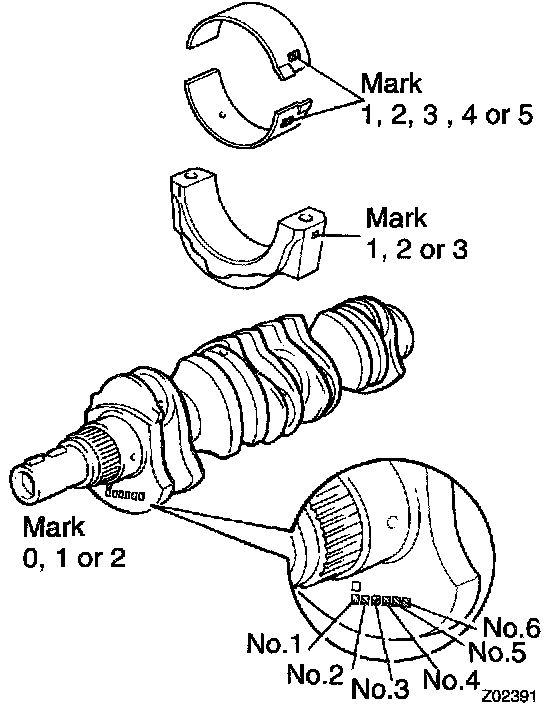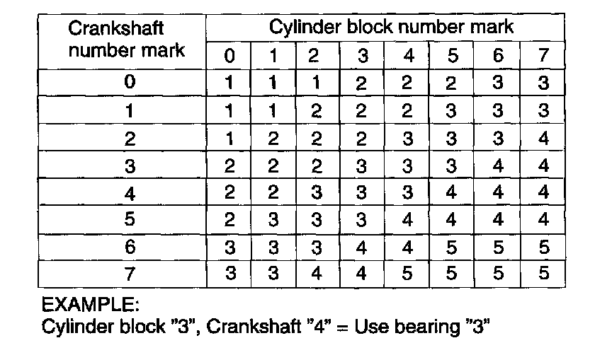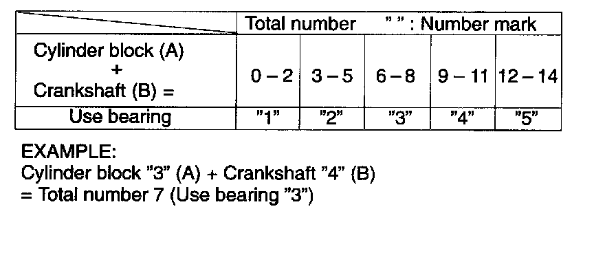 HINT: If using a standard bearing, replace with one having the same number. If the number of the bearing cannot be determined, select the correct bearing by adding together the numbers imprinted on the cylinder block and crankshaft, then refer to the table for the appropriate bearing number. There are 5 sizes of standard bearings, marked "1", "2", "3", "4" and "5" accordingly.