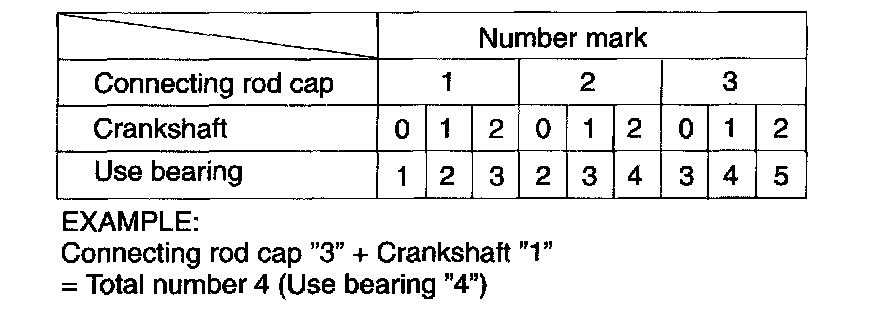 HINT: If using a standard bearing, replace with one having the same number. If the number of the bearing cannot be determined, select the correct bearing by adding together the numbers imprinted on the connecting rod cap and crankshaft, then selecting the bearing with the same number as the total. There are 5 sizes of standard bearings, marked "1", "2", "3", "4" and "5" accordingly.