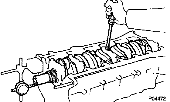 Using a dial indicator, measure the thrust clearance while prying the crankshaft back and forth with a screwdriver.