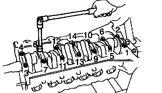 a. Uniformly loosen and remove the 14 main bearing cap bolts, in several passes, in the sequence shown.