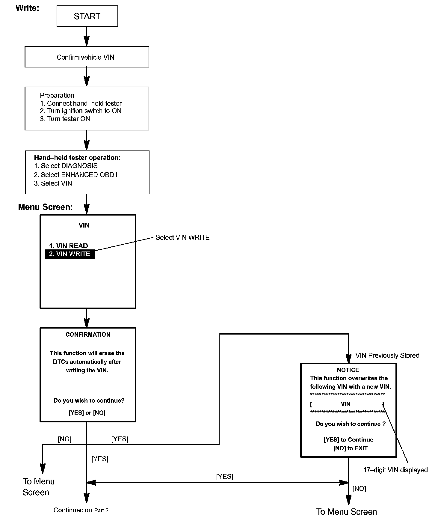 3. Write VIN: Explains the VIN writing process with the flowchart. This process allows the VIN to be input into the ECM. If the ECM is changed, or the VIN and VIN do not match, the VIN can be registered, or overwritten in the ECM by following this procedure.