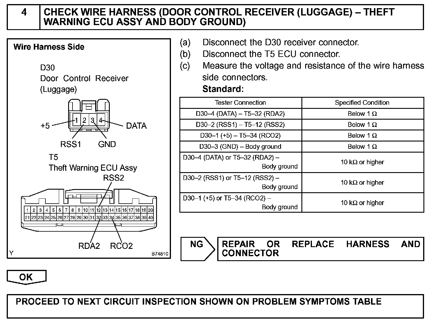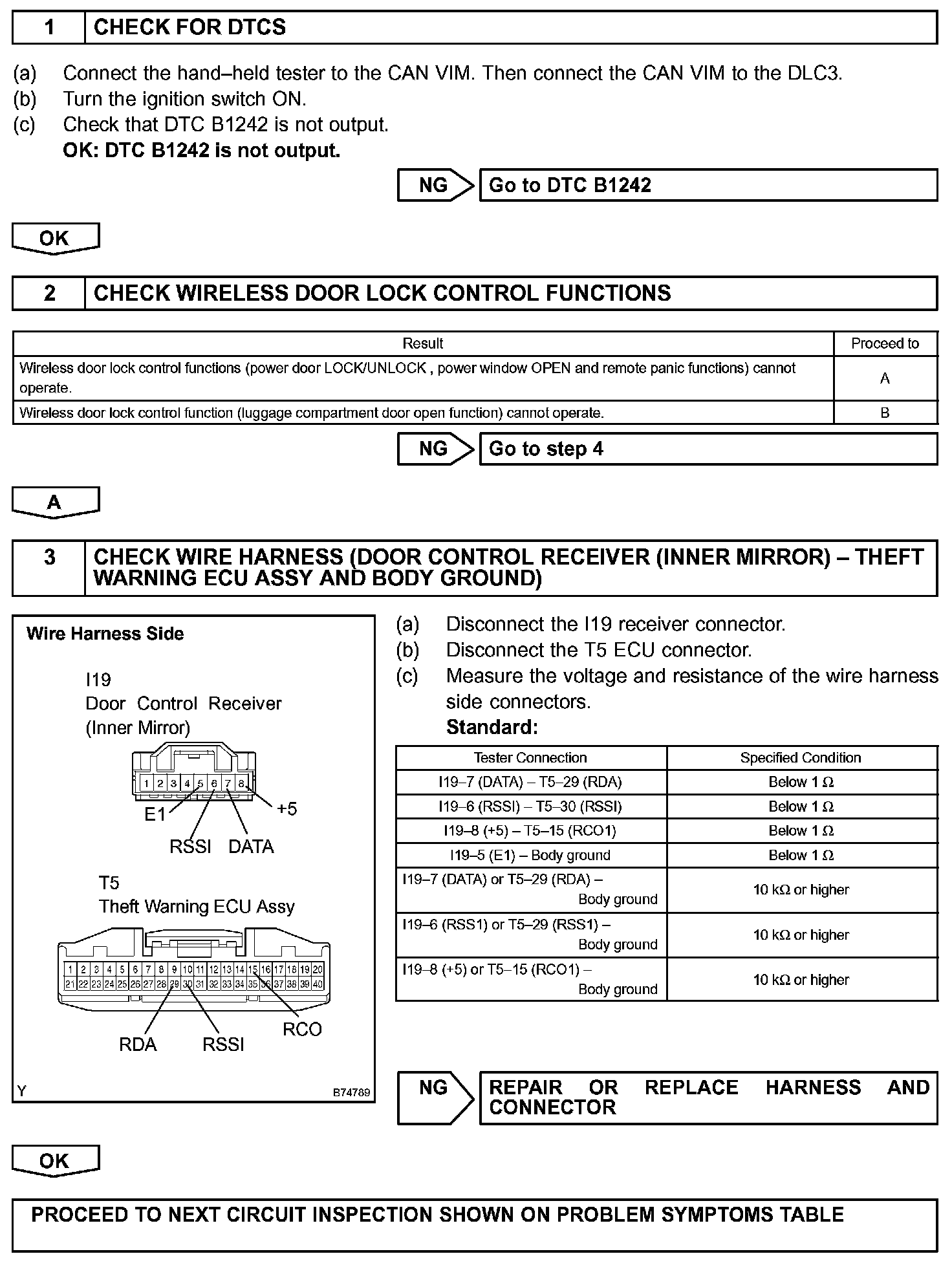 The signal from the transmitter is input to the theft warning ECU (theft deterrent ECU) through the RDA line. The status of the RDA, RDA2, RSS1 and RSS2 lines are diagnosed by the theft warning ECU. If the wireless door lock control system fails, check for DTCs to confirm if the cause is the RDA, RDA2, RSS1 and/or RSS2 line.