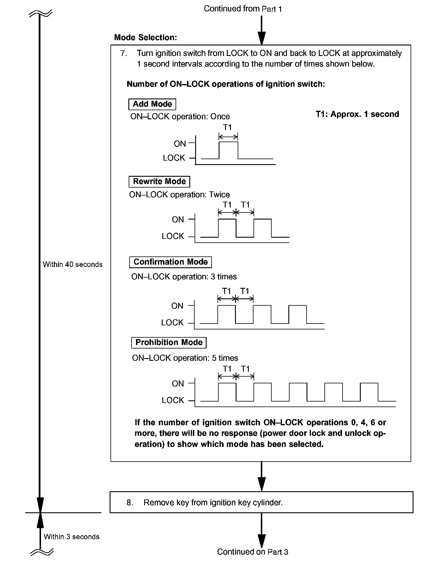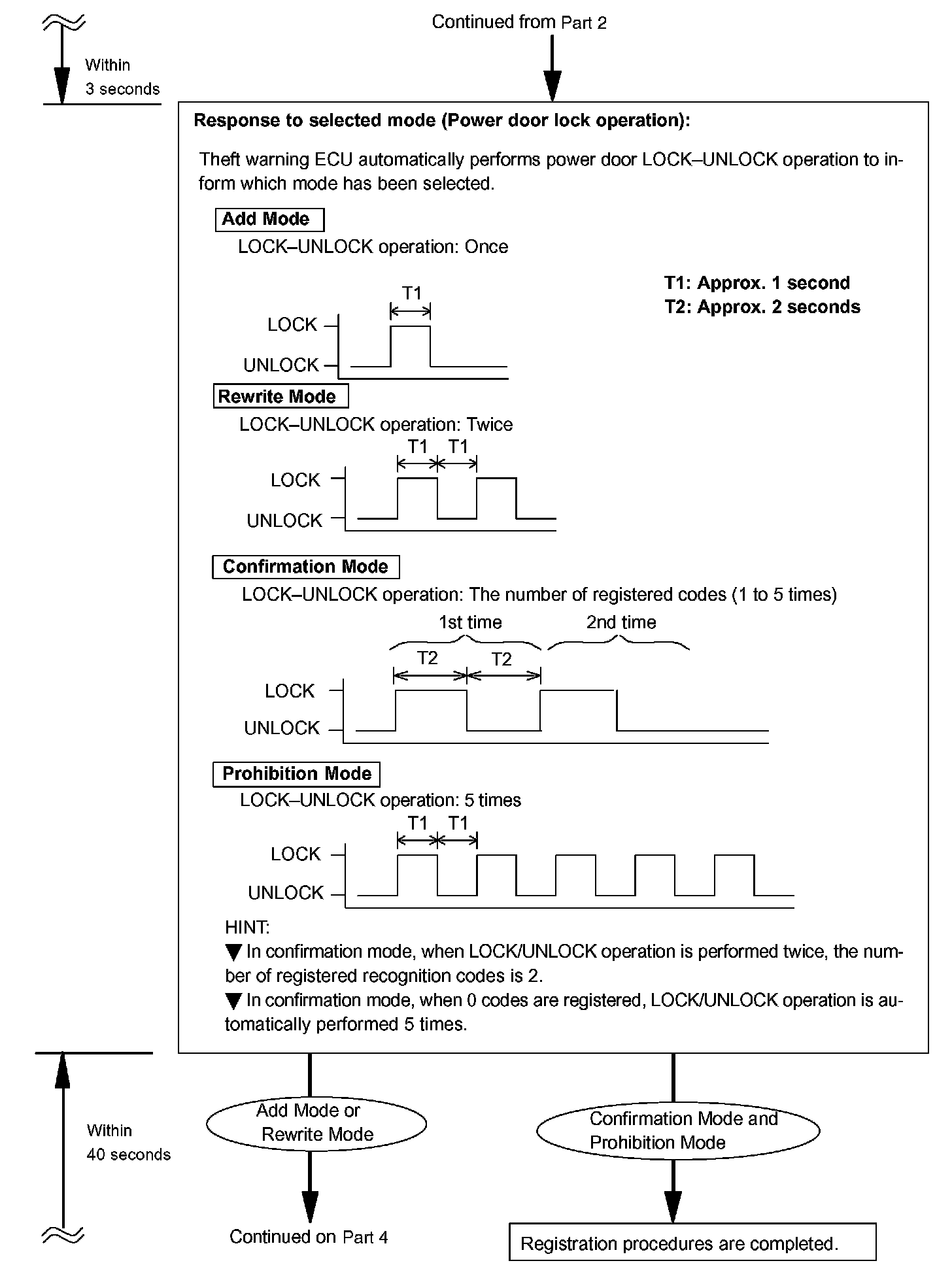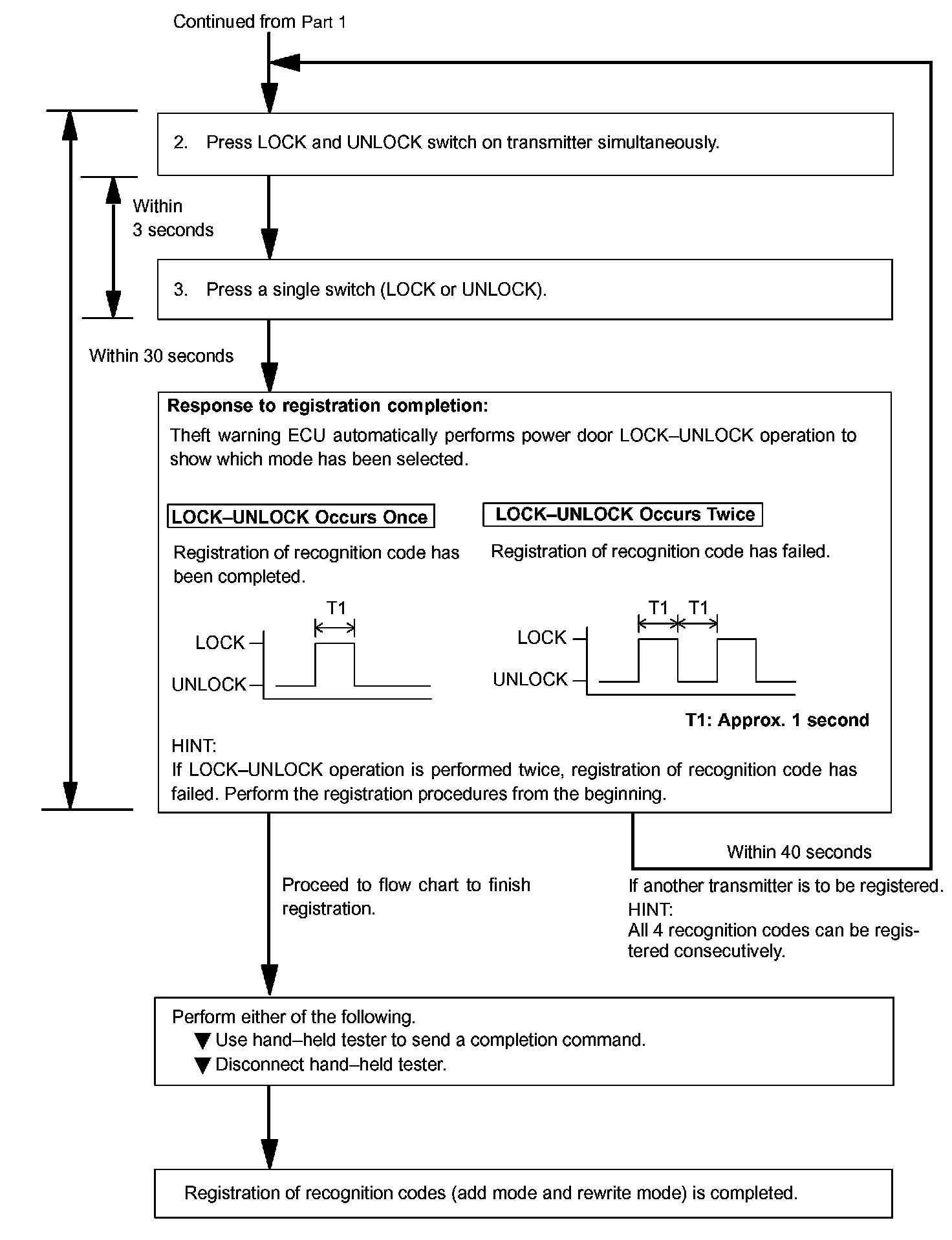 - Add mode is used to register new recognition codes while still retaining codes already registered. This mode is used when a new transmitter is added. If the number of registered codes exceeds 4, the previously registered codes will be erased, starting from the first registered code.
