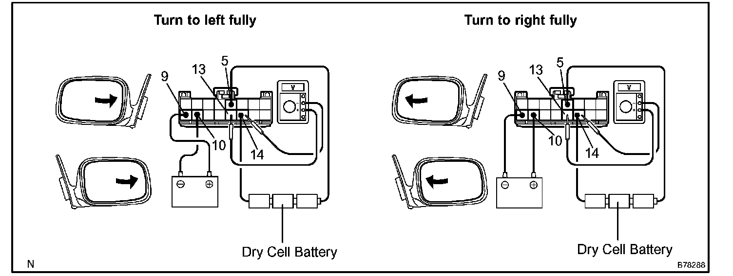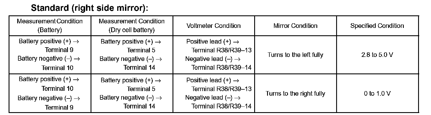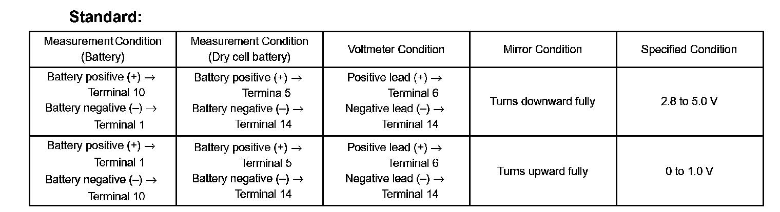 INSPECT MIRROR POSITION SENSORa. Apply voltage to the terminals with a battery and a dry cell battery, as shown in the table.