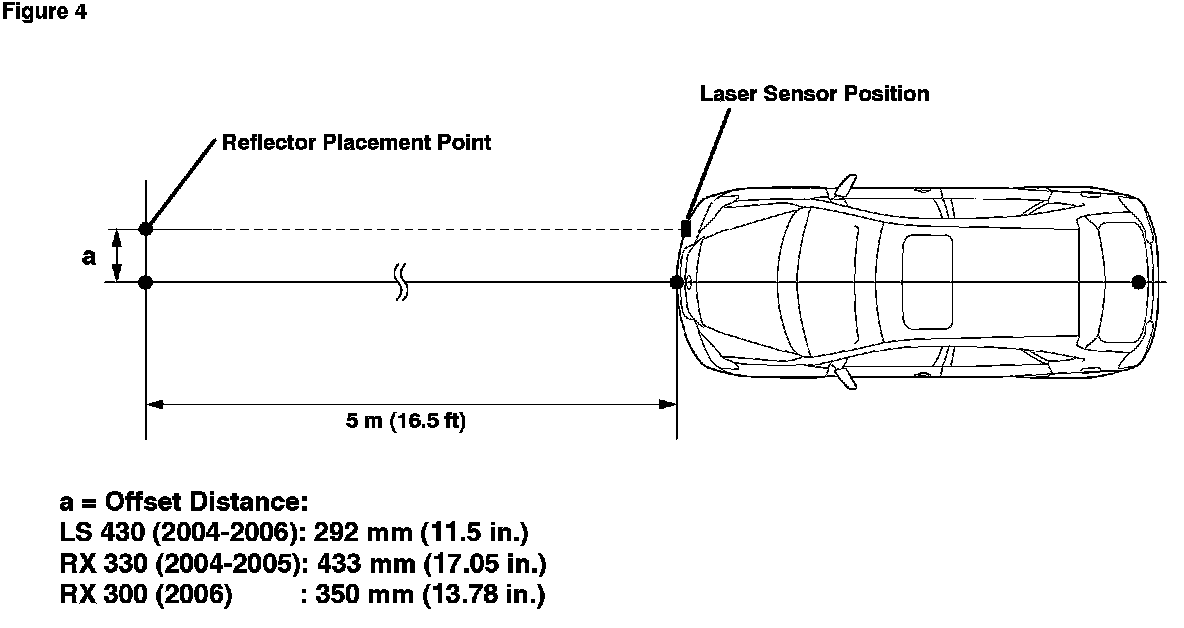 E. From the 5 m (16.5 ft) marked position, measure an offset distance of 350 mm (13.75 in.) to the right and place the reflector there.