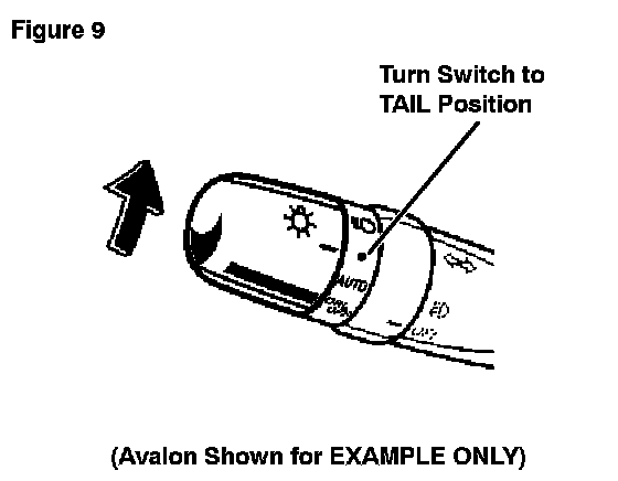 I. Turn the headlight dimmer switch from the "OFF" position to the TAIL position (e.g., parking, tail, license plate, side marker, and instrument panel lights) while the "LASER CRUISE DIVERGENCE DATA" screen is still shown on the Diagnostic Tester. (Beam axis adjustment will be performed automatically.)
