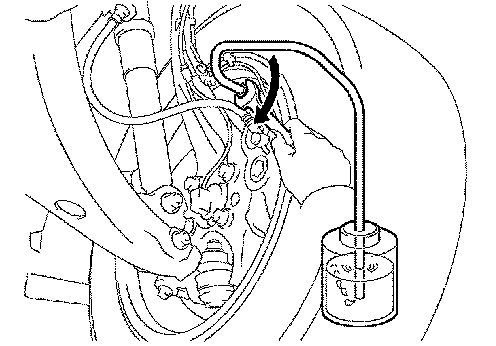 1. Connect the vinyl tube to the bleeder plug at the right front wheel or the right rear wheel and loosen the bleeder plug.