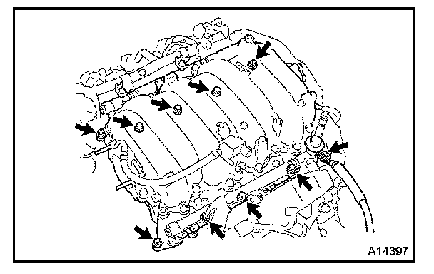 b. Install the upper and lower intake manifolds assembly with the 6 bolts and 4 nuts.