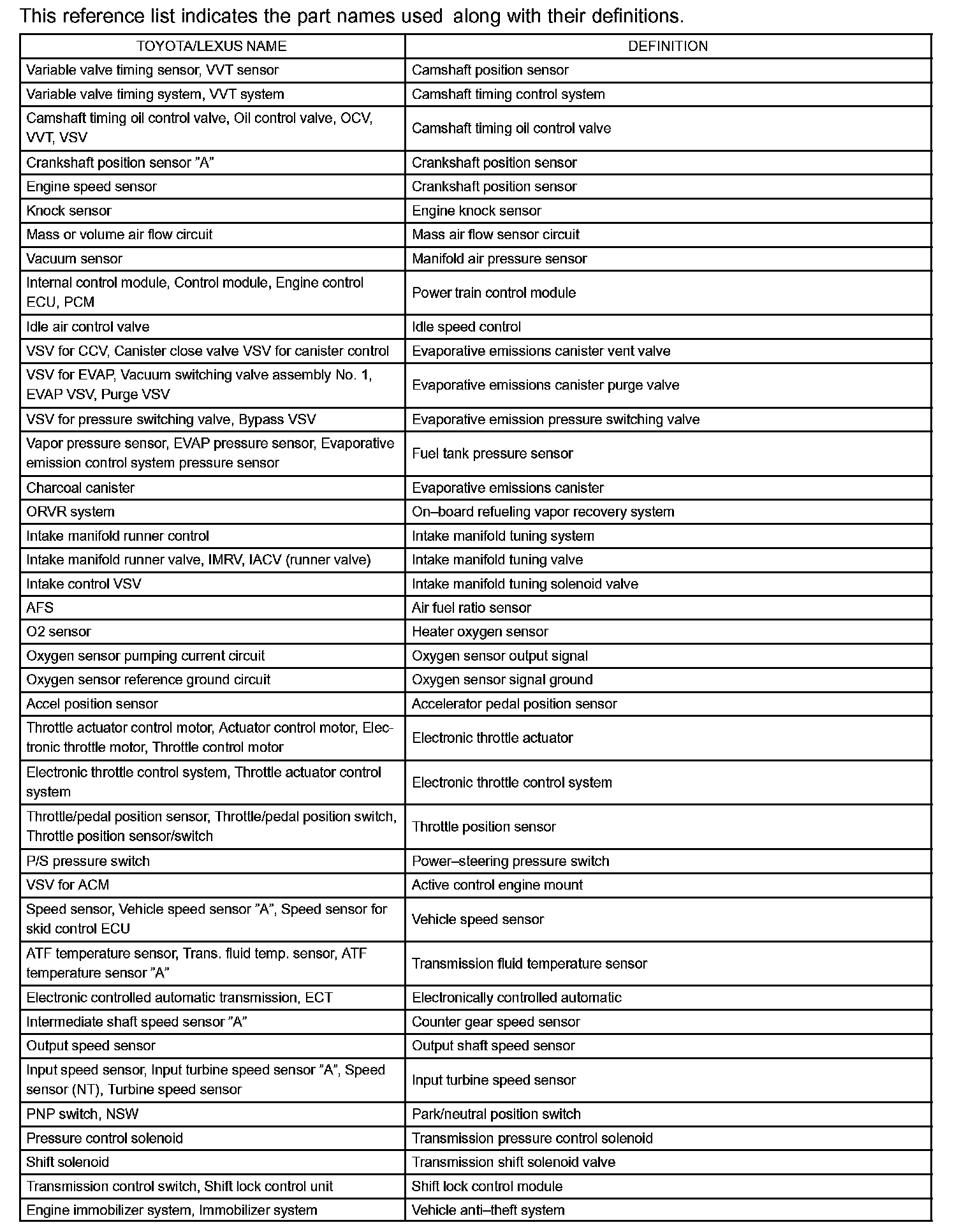 Parts and System Name List