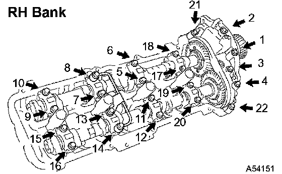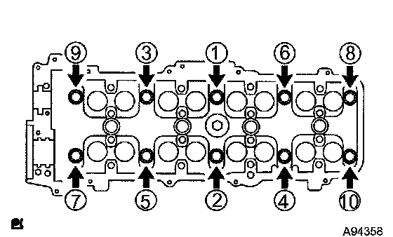 Install and uniformly tighten the 10 cylinder head bolts, and plate washers in the sequence shown in the illustration.