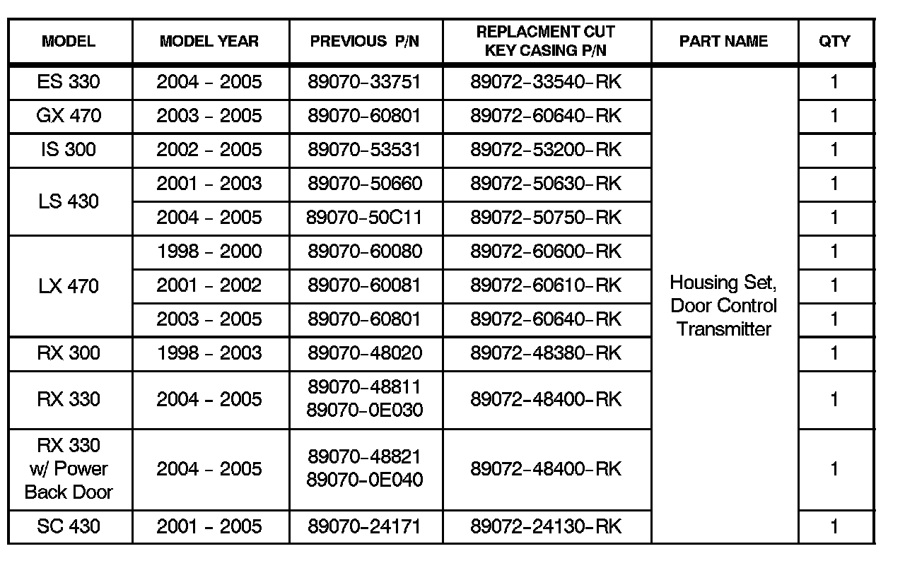 ^ March 10, 2006: The Replacement Cut Key Casing P/N for 1998 - 2000 model year LX 470 vehicles in the Parts Information table has been updated.