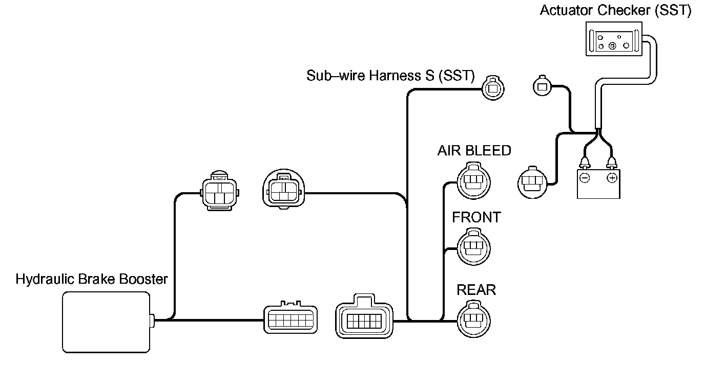 b. Connect the actuator checker (SST) to the hydraulic brake master cylinder side wire harness via the sub-wire harness S (SST), as shown in the illustration.