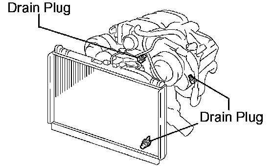 b. Loosen the radiator drain plug and 2 drain cock plugs, then drain the coolant.