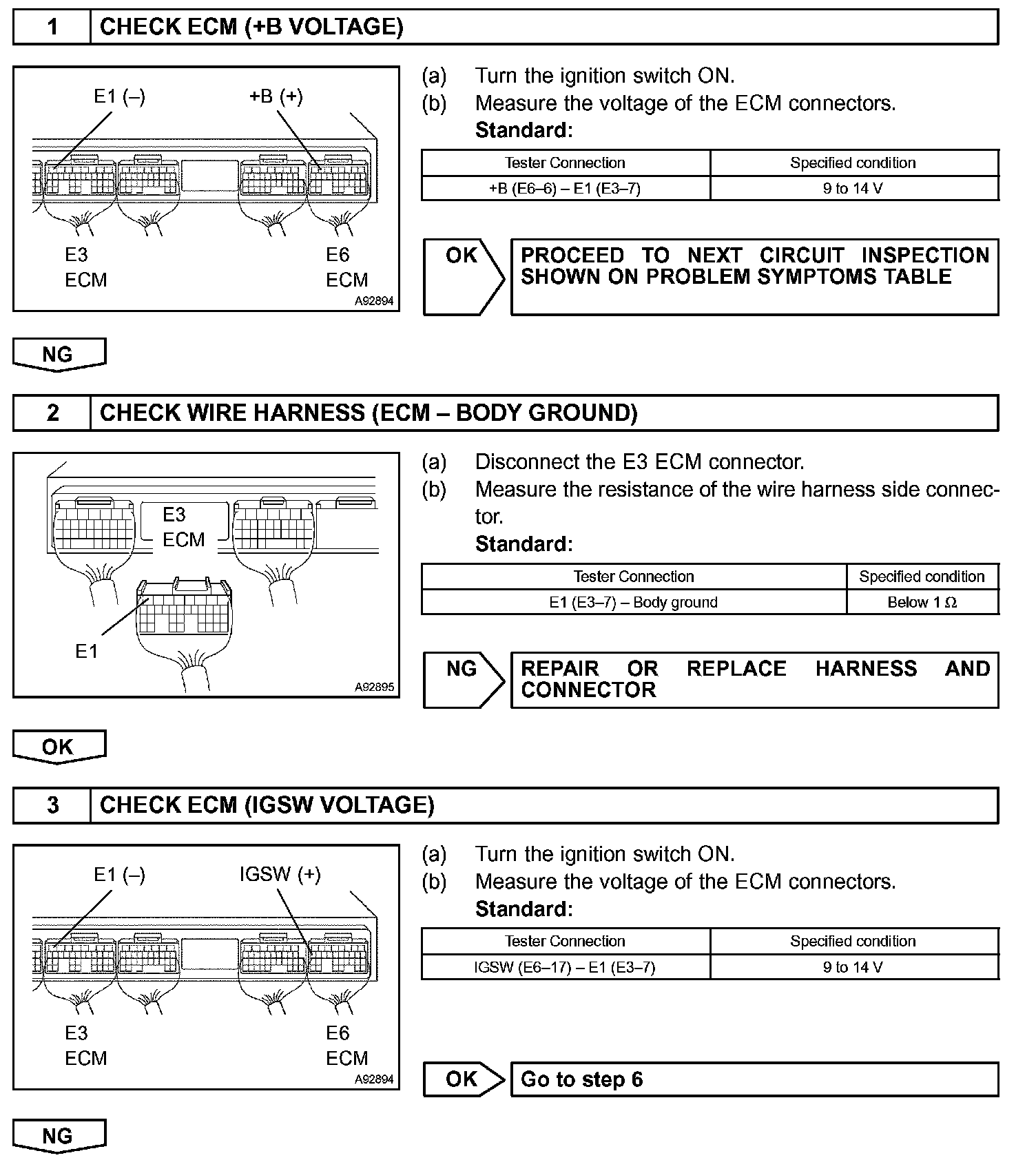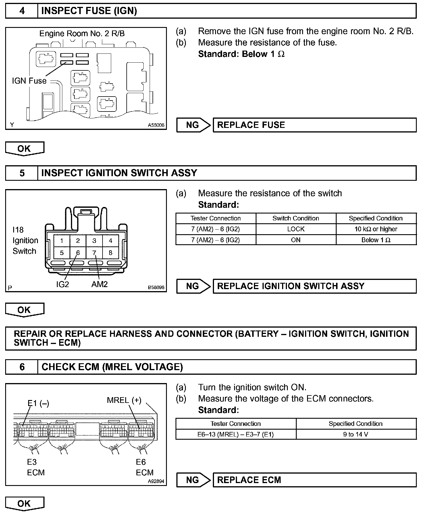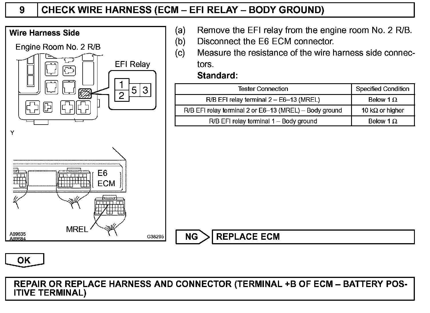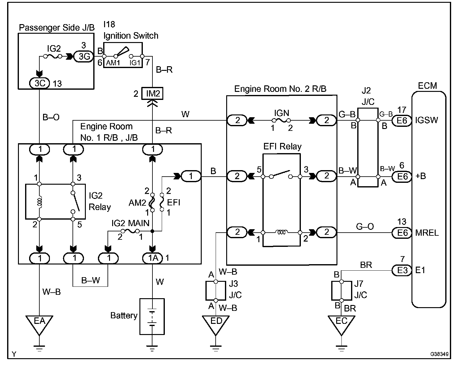 When the ignition switch is turned ON, battery voltage is applied to terminal IGSW of the ECM. The ECM "MREL" output signal causes current to flow to the coil, closing the contacts of the EFI relay and supplying power to terminal +B of the ECM.
