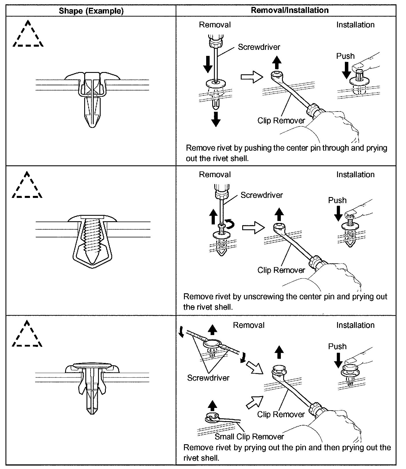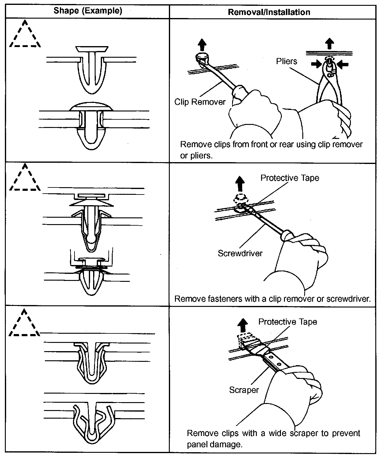 1. The removal and installation methods of typical clips used for vehicle body parts are shown in the table.