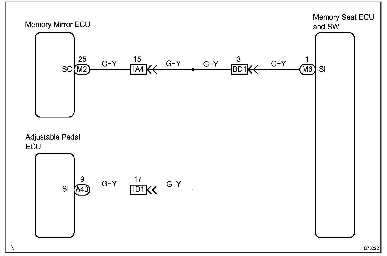 The power seat control system controls the storing and restoring of the adjustable pedal and power mirror position. During this operation, the store/restore operation signals are sent/received using serial communication.