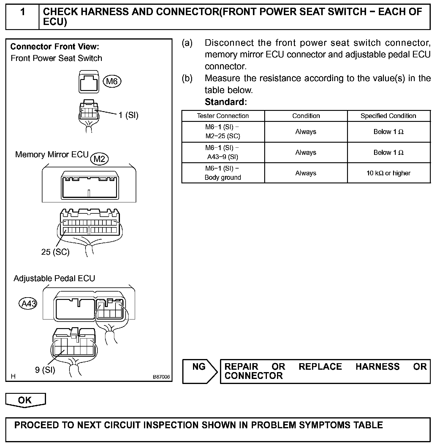 - The adjustable pedal restore signal is not received for 2 seconds while power seat control is operating.