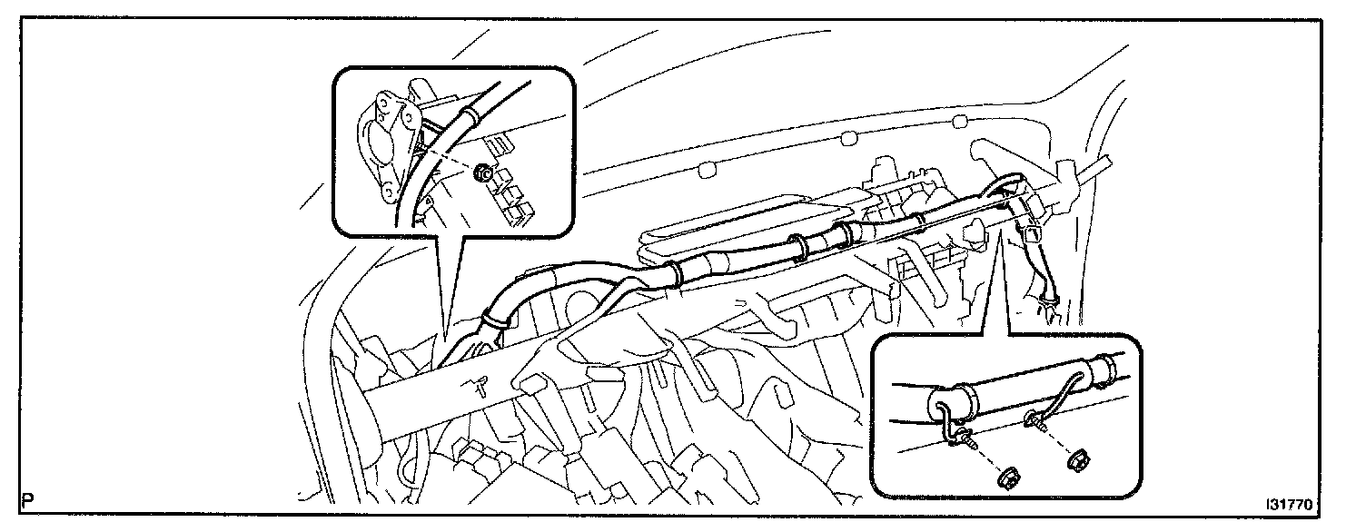 a. Remove the 2 clamps, nut and passenger side junction block.