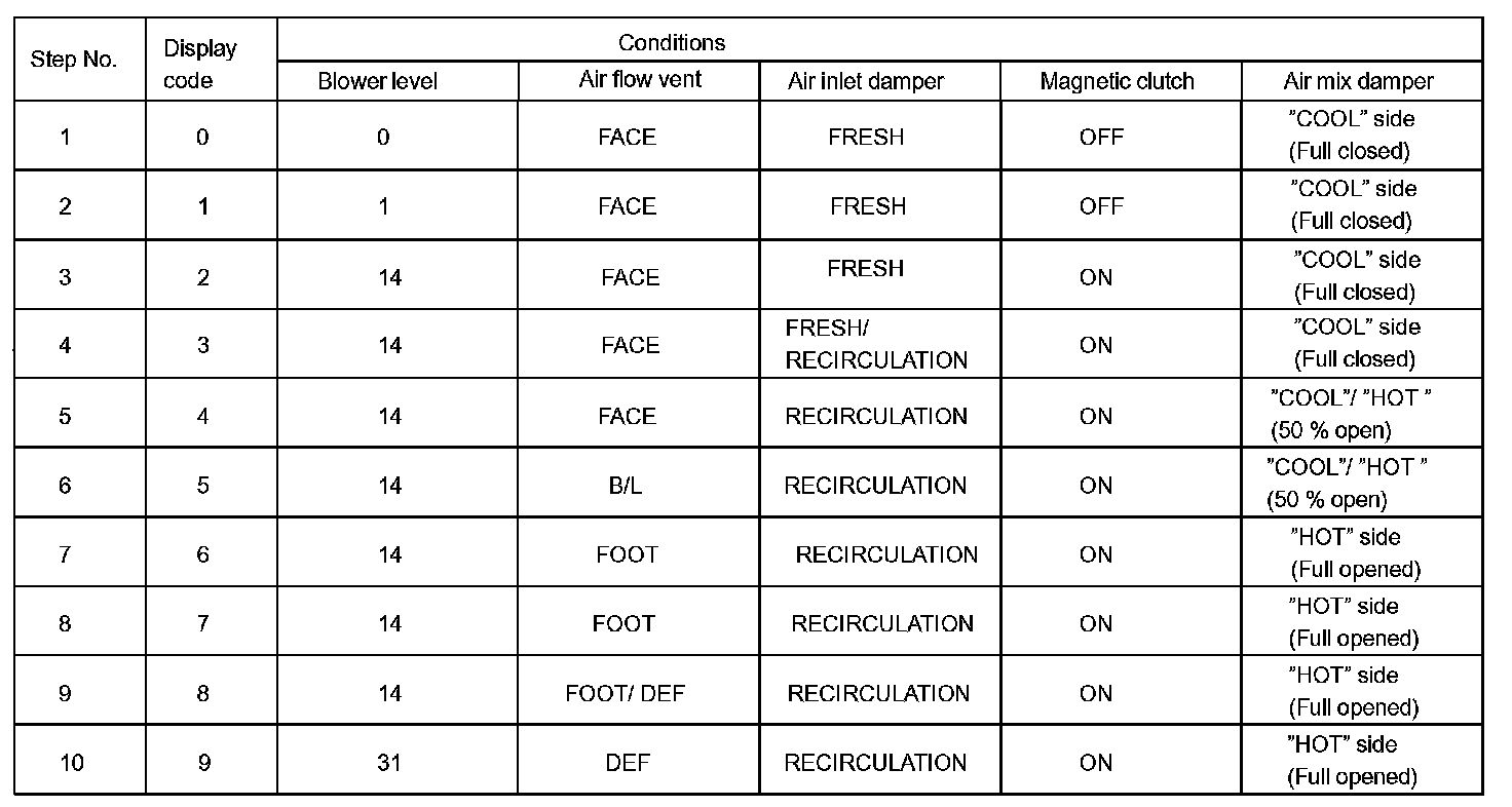 LIST OF OPERATION METHODSa. By operating each of the A/C control switches as shown the diagram, it is possible to enter the diagnosis check mode.