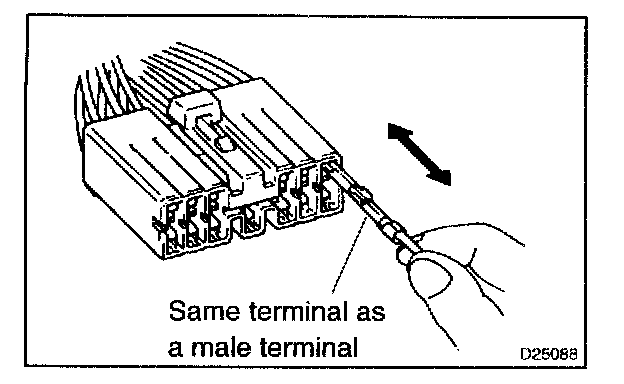 2. In case of abnormal contact pressure, replace the female terminal. At this time, if a male terminal is gold-plated (gold color), use gold-plated female terminals and if it is silver-plated (silver color), use silver-plated female terminals.