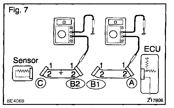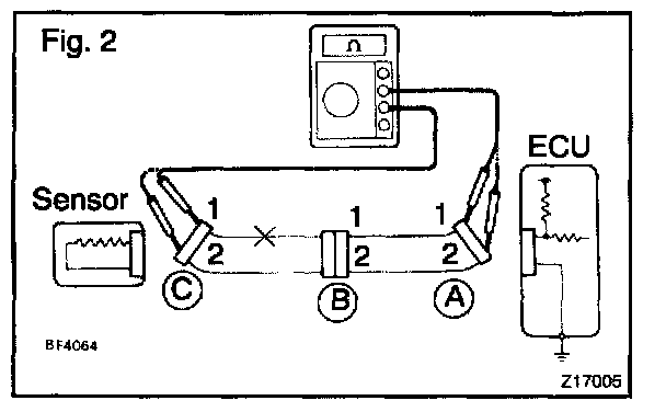 1. Disconnect the connectors "A" and "C" and measure the resistance between them.