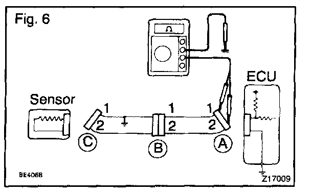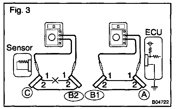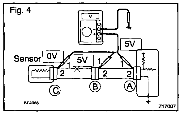 As shown in Fig. 4, with each connector still connected, measure the voltage between the body ground and terminal 1 of connector "A" at the ECU 5 V output terminal, terminal 1 of connector "B", and terminal 1 of connector "C", in that order.