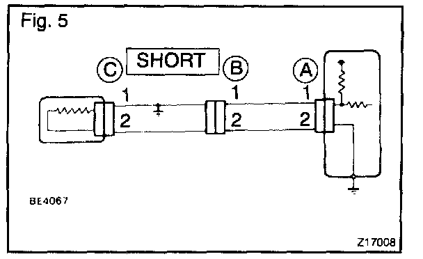 a. If the wire harness is ground shorted as in Fig. 5, locate the section by conducting a "continuity check with the body ground".