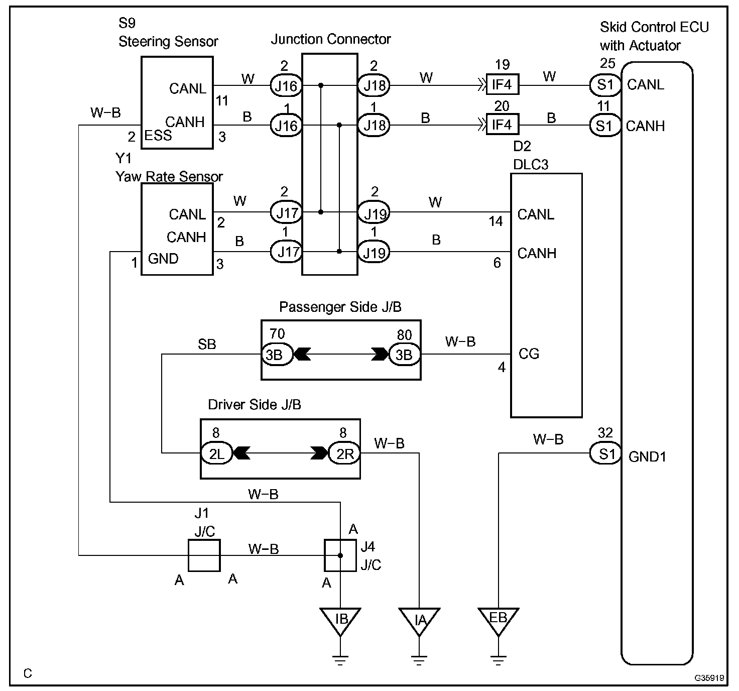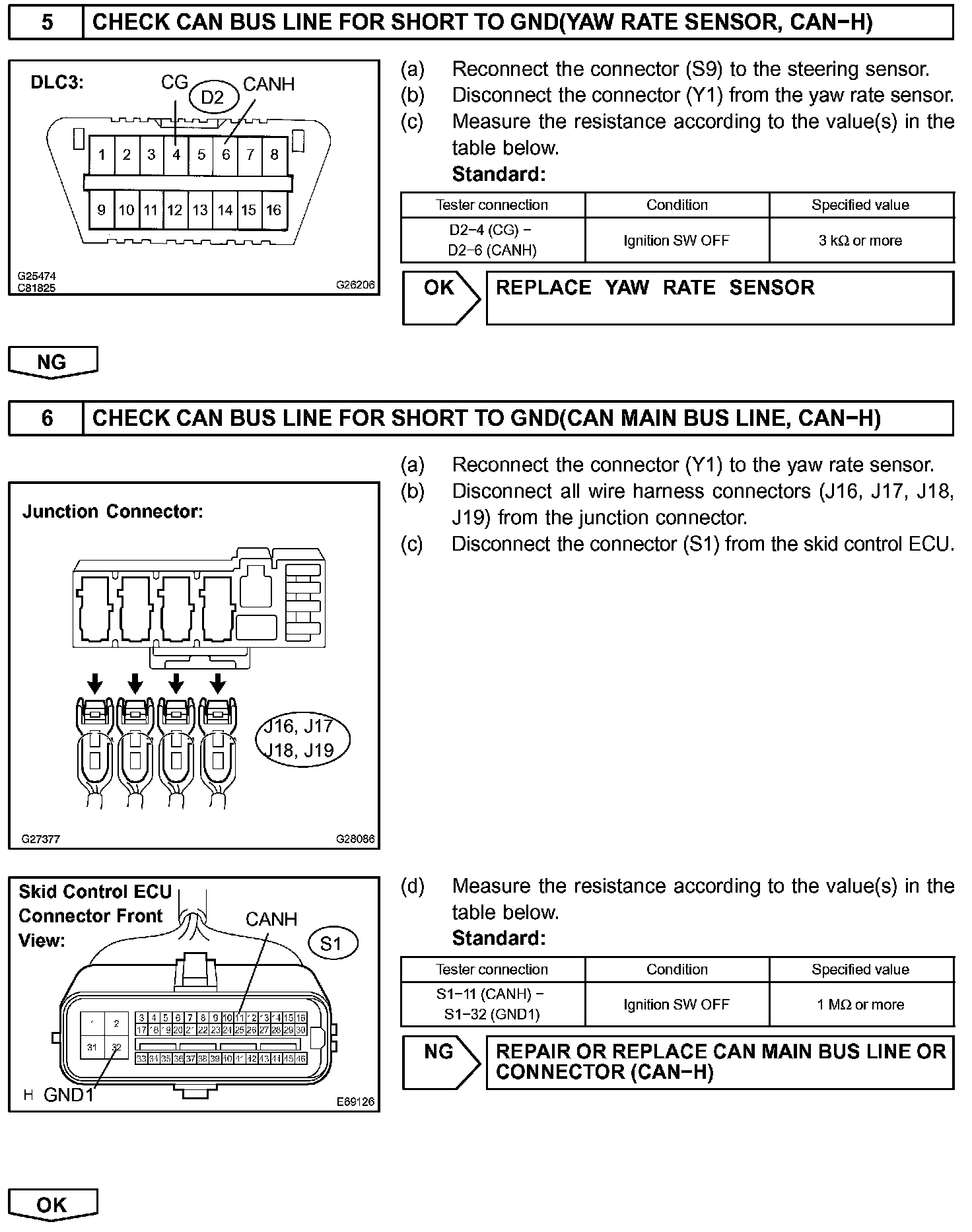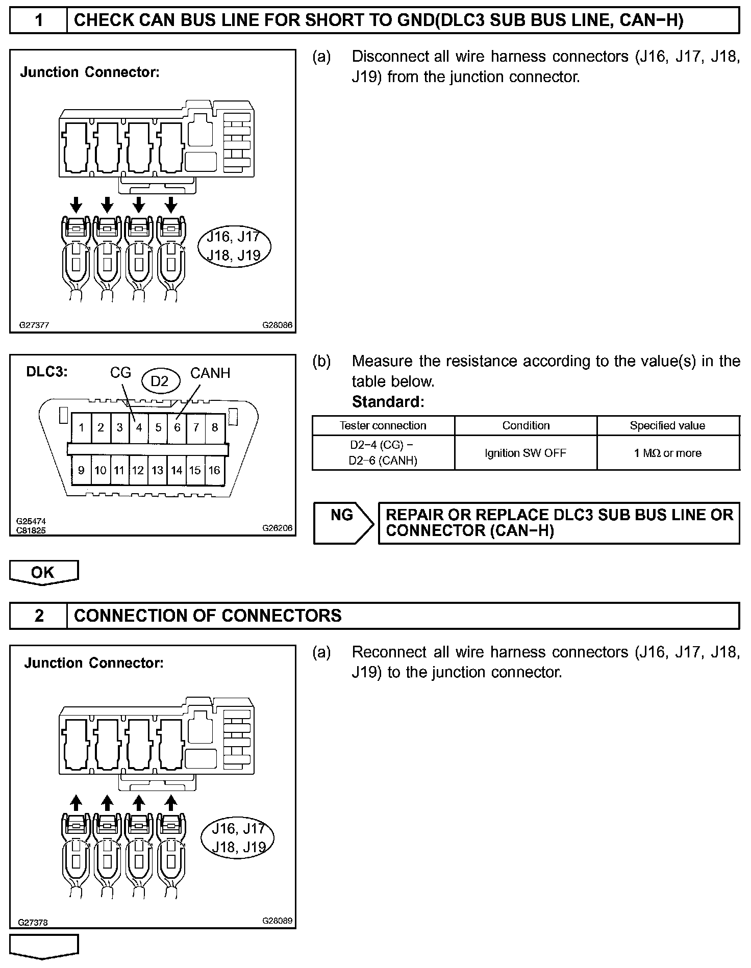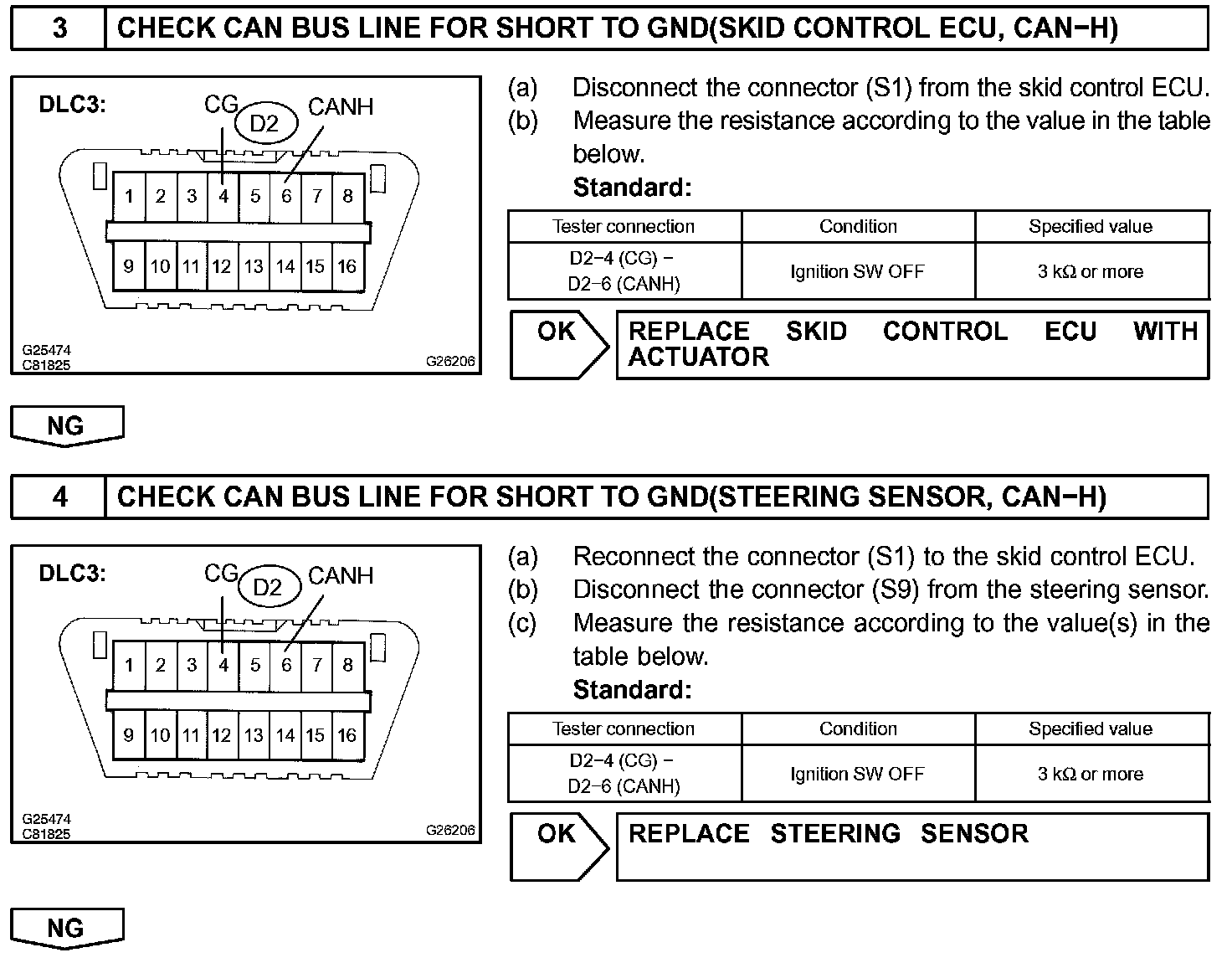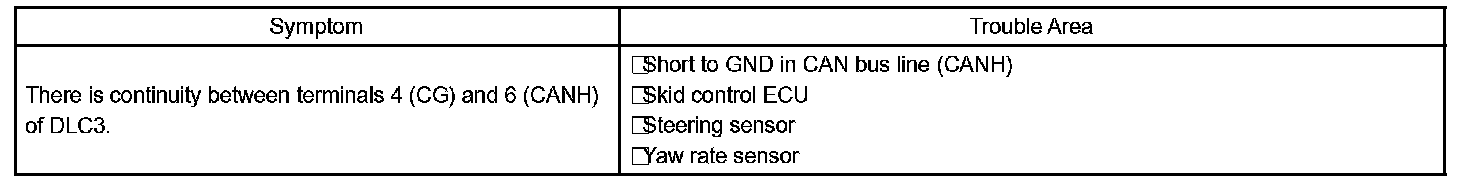 A short to GND is suspected in the CAN bus line when there is continuity between terminals 4 (CG) and 6 (CANH) of the DLC3.