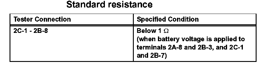 2. Connect the battery's positive (+) lead to terminals 2A-8 and 2C-1, and negative (-) lead to terminal 2B-3 and 2B-7. Using an ohmmeter, check that there is resistance between terminals 2C-1 and 2B-8 when battery voltage is applied between the terminals.