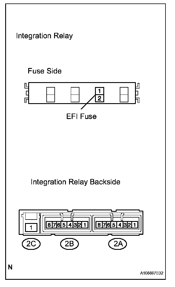 2. Connect the battery's positive (+) lead to terminal 2A-6 and negative (-) lead to terminal 2A-7. Using an ohmmeter, check that there is resistance between EFI fuse terminal 2 and terminal 2A-8 when battery voltage is applied between the terminals.